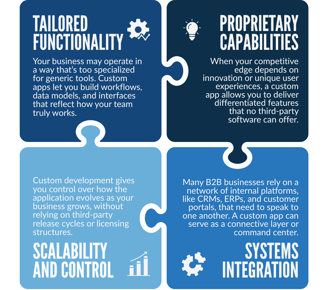 For today’s B2B organizations, the limitations of off-the-shelf software are becoming more apparent. Whether you’re looking to streamline internal operations, improve customer or partner experiences, or create a competitive advantage through digital tools, a custom application can provide the flexibility and control needed to support your business goals.