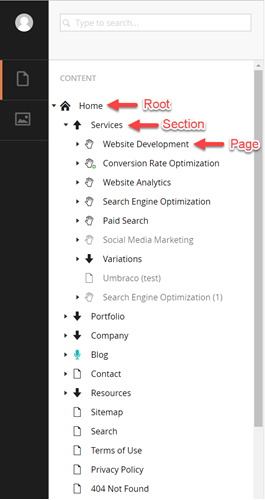 With Umbraco, creating, updating, and editing content is easier. Not only is the Umbraco rich text editing interface user intuitive and easy to use, but you’ll able to create and categorize content with a few clicks. Umbraco uses the tree menu, which looks like this in the Umbraco backend…