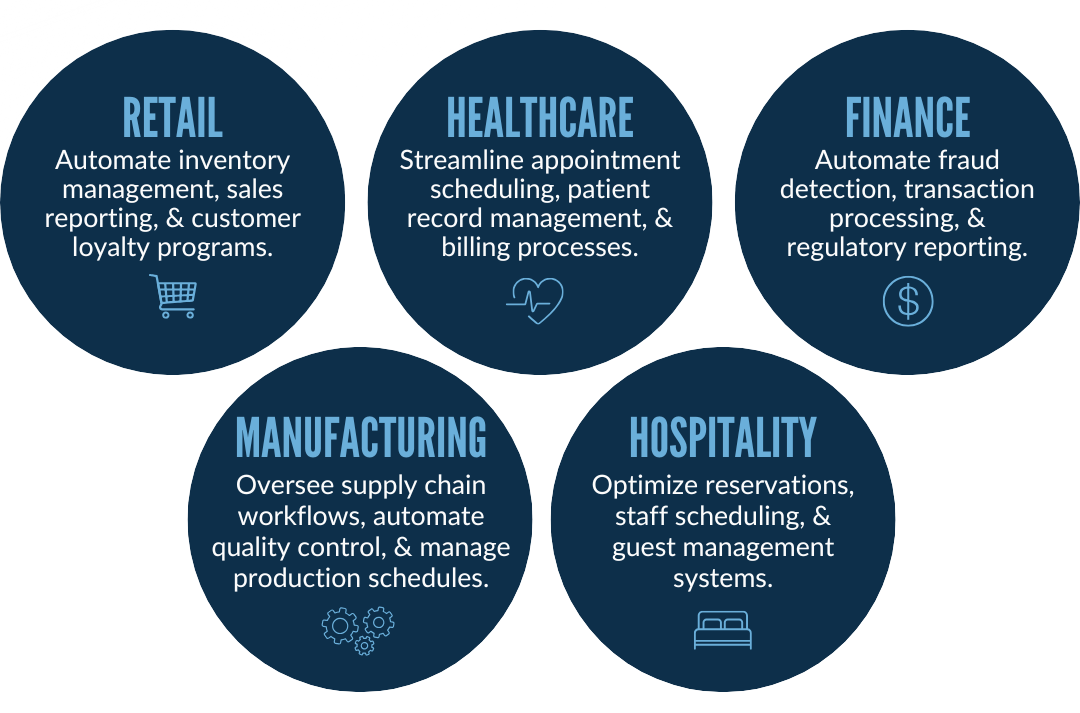 - Retail: Automate inventory management, sales reporting, and customer loyalty programs.