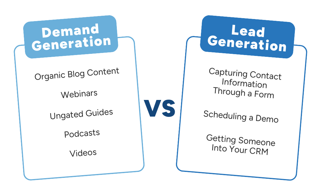 Demand generation is the art of creating interest before someone is actively shopping. It’s about brand visibility, thought leadership, education, and building trust over time. You’re warming up the market, often without asking for anything in return. Tactics like organic blog content, webinars, ungated guides, podcasts, and video fall into this category. These assets don’t always drive immediate conversions, but they increase your visibility and credibility with key audiences.