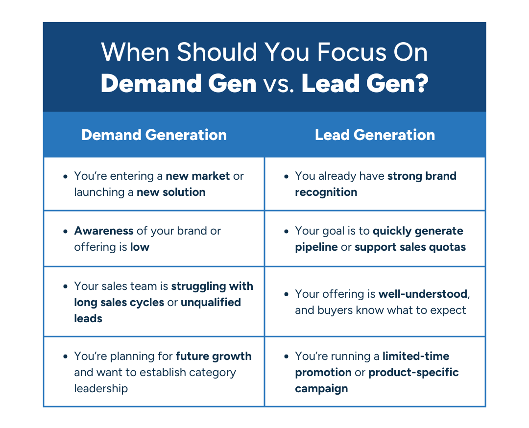 So when should you focus on demand gen vs. lead gen? It depends on your business goals, product maturity, and pipeline health.
