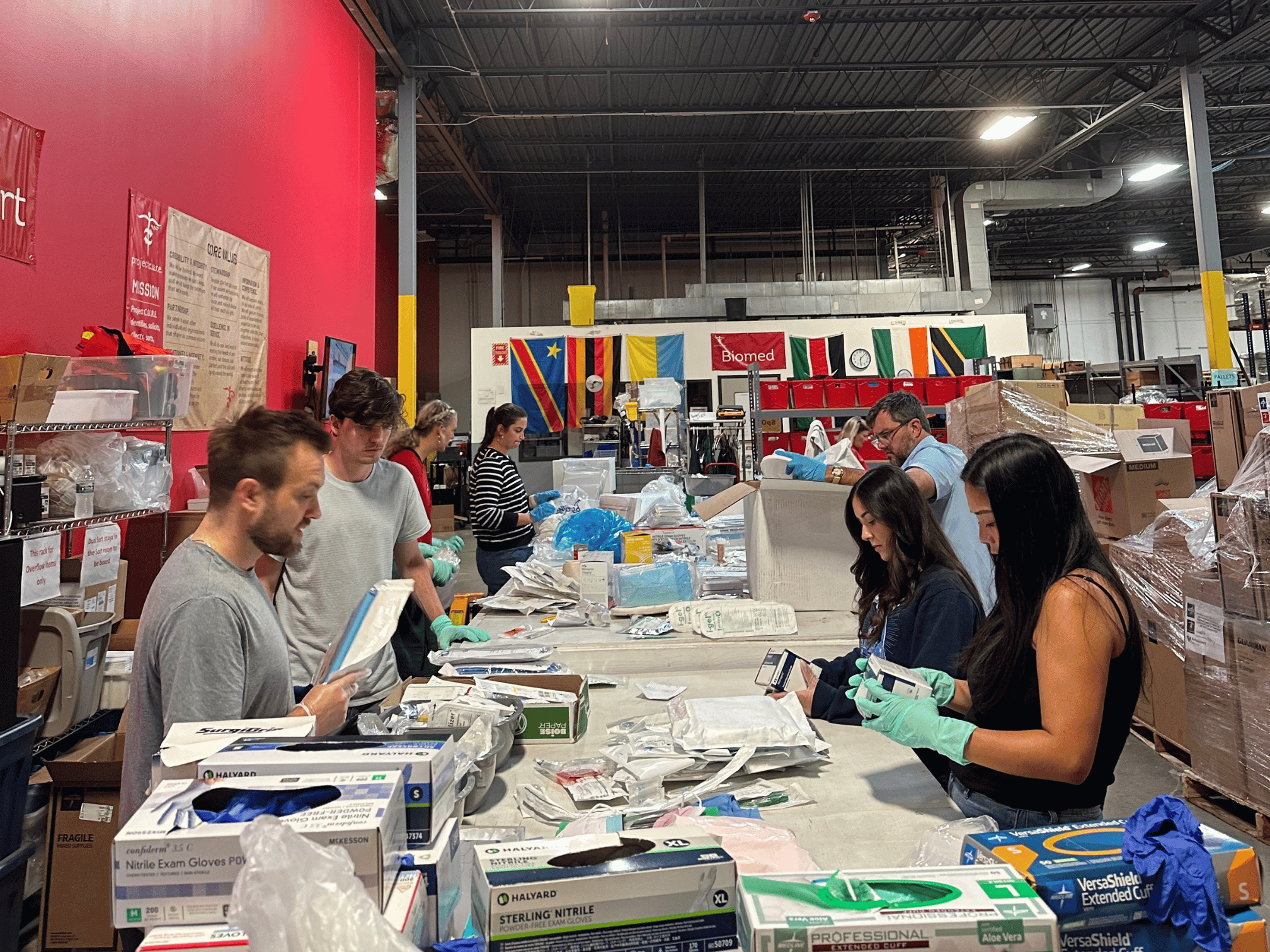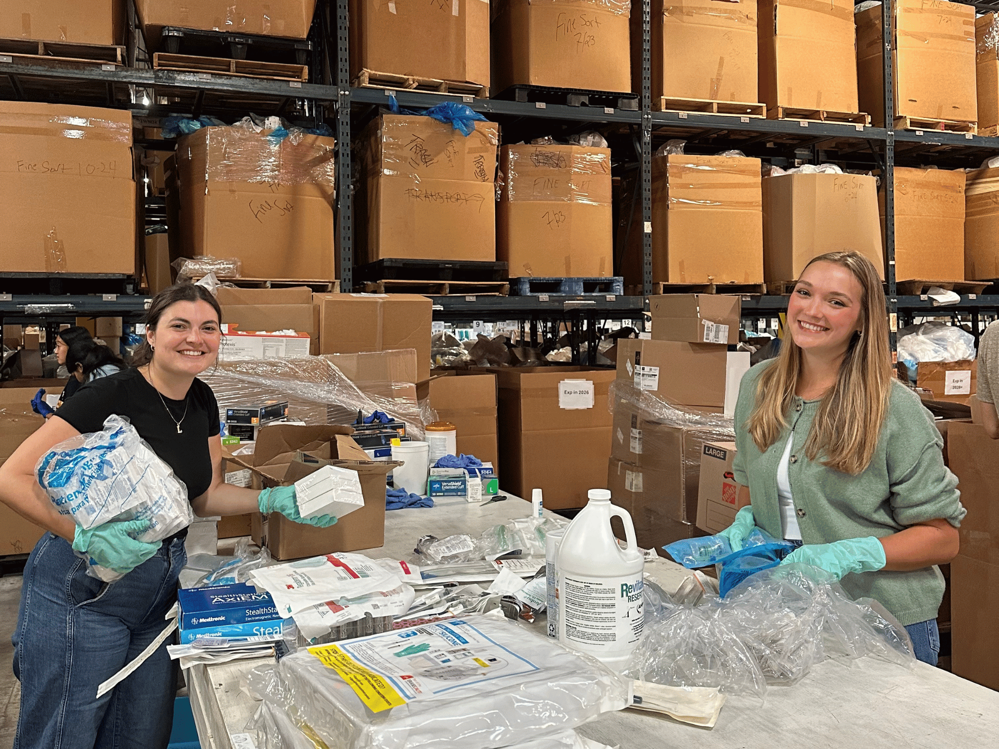We started with the first phase of sorting - checking expiration dates and ensuring that only usable medical supplies moved forward in the process. From there, we organized items into grouping bins so they could later be packed and shipped.