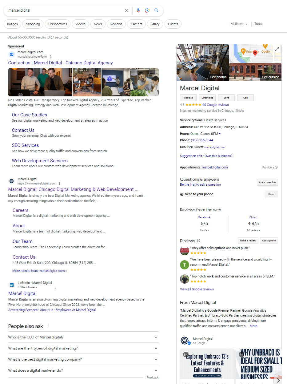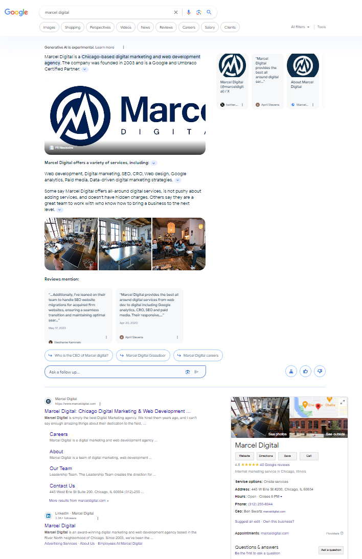 The screenshot below displays the layout differences between the standard SERP and SGE on the same search query for “marcel digital”: