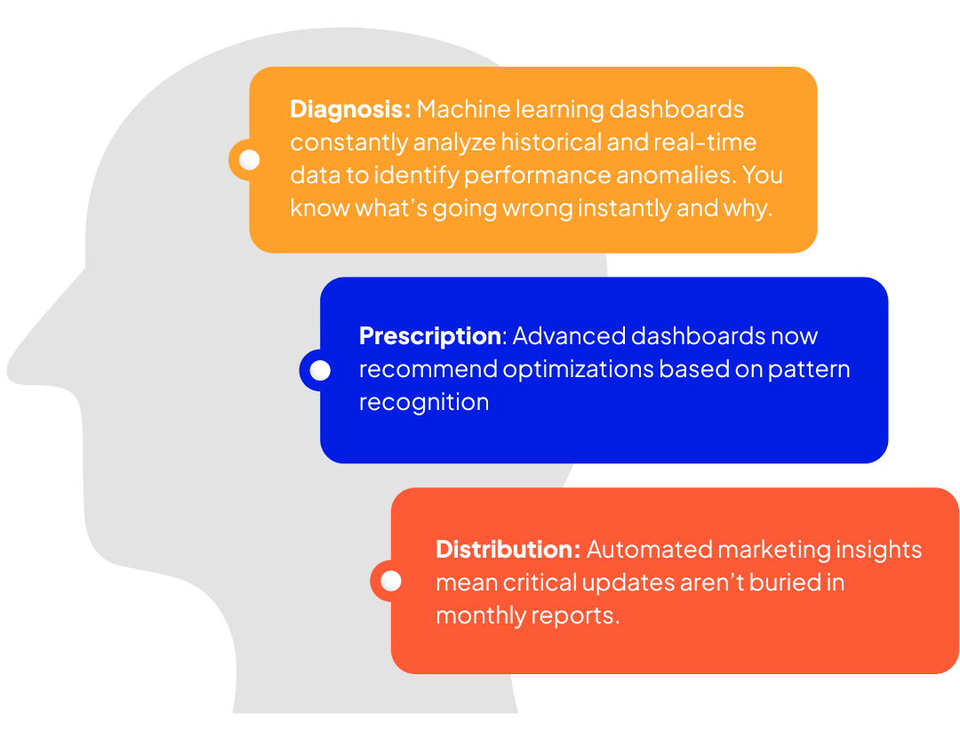 - Prescription: Advanced dashboards now recommend optimizations based on pattern recognition. For example, an AI-powered reporting tool may suggest budget shifts based on week-over-week engagement decay or alert you to audiences that are behaving differently than expected.