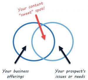 The image below shows you how to find your content sweet spot. What we’re looking at here are two circles: one is your business offerings (services, products, and offerings) and the other is your prospect’s issues and needs. Your goal is to create content that falls right in the middle.