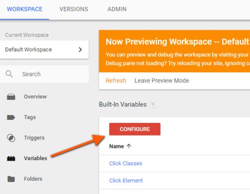- If you haven’t done so already, navigate to the “Variables” Tab in the left rail and then “Configure” under the Built-In Variables section.