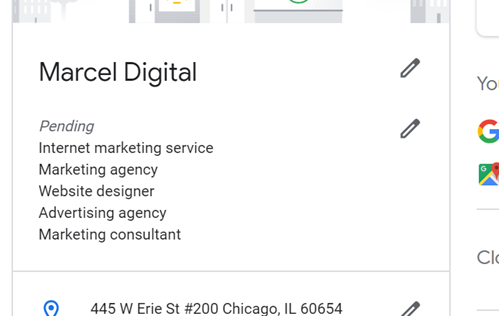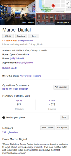 GMB allows business owners to edit the business or branded information that searchers find, including hours of operation, address, and phone number(s). In addition, Google My Business allows owners to post photos related to their business in order to give searchers a better sense of that business. It also gives customers an opportunity to review the business and owners a chance to respond to those reviews. Here's an example of what comes up when you search "Marcel Digital" in Google: