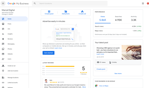 It's important to note that all of the above features and capabilities are available through your Google My Business dashboard. When you login and select your business listing, you'll be brought to a page that looks like this: