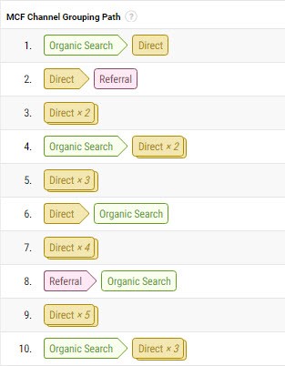 Users typically consult multiple channels before they’re ready to convert on your website. While not all channels are trackable (i.e. review websites), Google Analytics does a good job of visualizing the data it has on hand. Here’s an image of the “Top Conversion Paths” report you can find in Google Analytics.
