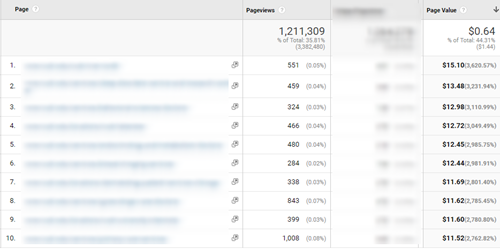 Google Analytics will actually help you see which of your pages are the most valuable as far as reaching the final goal and getting a completed transaction. Page Values will be calculated depending on whether the user visited a page before completing a transaction. After some filtering of converting pages and sorting by the highest page value, you can see a standard All Pages report gives us more insights into what pages drive the most value.
