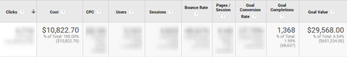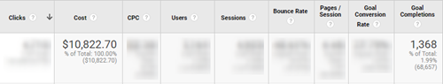 From this data, we would likely look at metrics like % difference in leads compared to the prior month. Perhaps we put the two numbers together and evaluate cost per conversion (Cost / Conversions = $7.91). Maybe that’s good, we’re not sure. There’s no way of knowing if we are seeing a positive return or not from our investment. We can only compare against our own historical performance. Now if we include goal values, we can start getting a better picture.