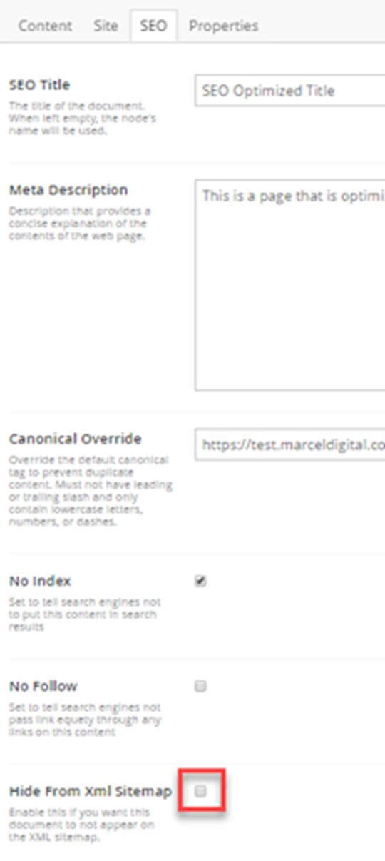Note: You must have your sitemap XML generation functionality in place in order for this to work. Marcel Digital also offers a sitemap XML generator for Umbraco if you need one! You can read documentation here about how the two extensions can work together here under the “Hide from Sitemap XML” section.