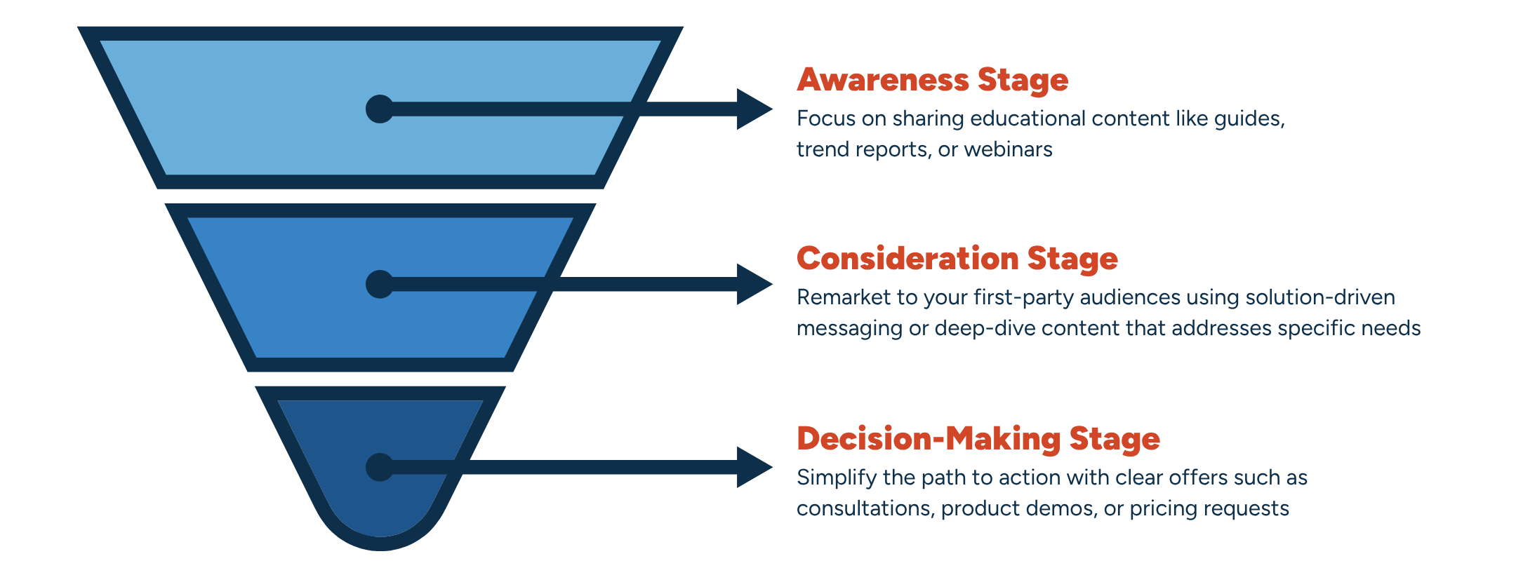 In the middle of the funnel, remarket to your first-party audiences using solution-driven messaging, case studies, or deep-dive content that addresses specific needs.