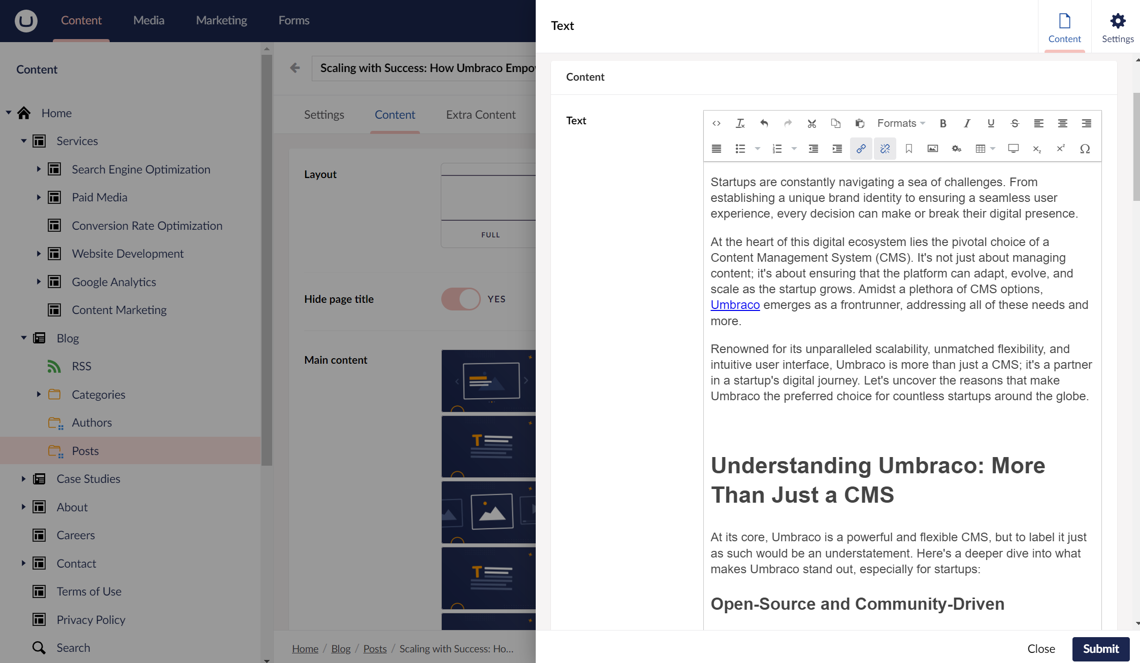 Umbraco’s intuitive interface is designed with the user in mind, eliminating the steep learning curves often associated with powerful digital platforms. Simple drag-and-drop functionalities, clear content hierarchies, and a clean dashboard mean that tasks which once required technical intervention can now be executed in a few clicks. For startups, this translates to a faster-paced, more collaborative environment. When a content creator can directly upload a blog post, or a product manager can update product details without waiting for IT support, it accelerates workflows and ensures that the website remains dynamic and up-to-date.