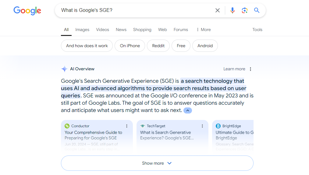 In May 2023, Google announced its plans to completely change search by adding AI-generated answers. This new era of search, known as Google’s Search Generative Experience (SGE), is the company’s latest and most advanced update to its search engine in the last decade.