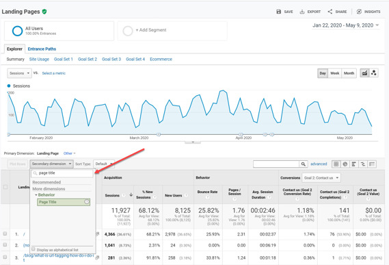 From there, set the Dimension to “Page title and screen class” and set “Page path and screen class” as the secondary dimension. Then you just need to search the text of your 404 page title in the search bar above.
