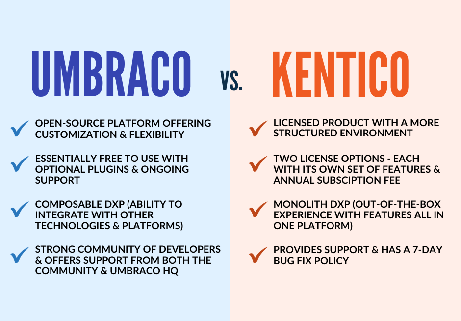 Umbraco excels in flexibility and customization, thanks to its open-source nature. Umbraco is considered a composable DXP because of its ability to integrate with other best-in-class technologies and platforms. Kentico is more of a monolith DXP, offering an out-of-the-box experience with advanced marketing features all in one platform.