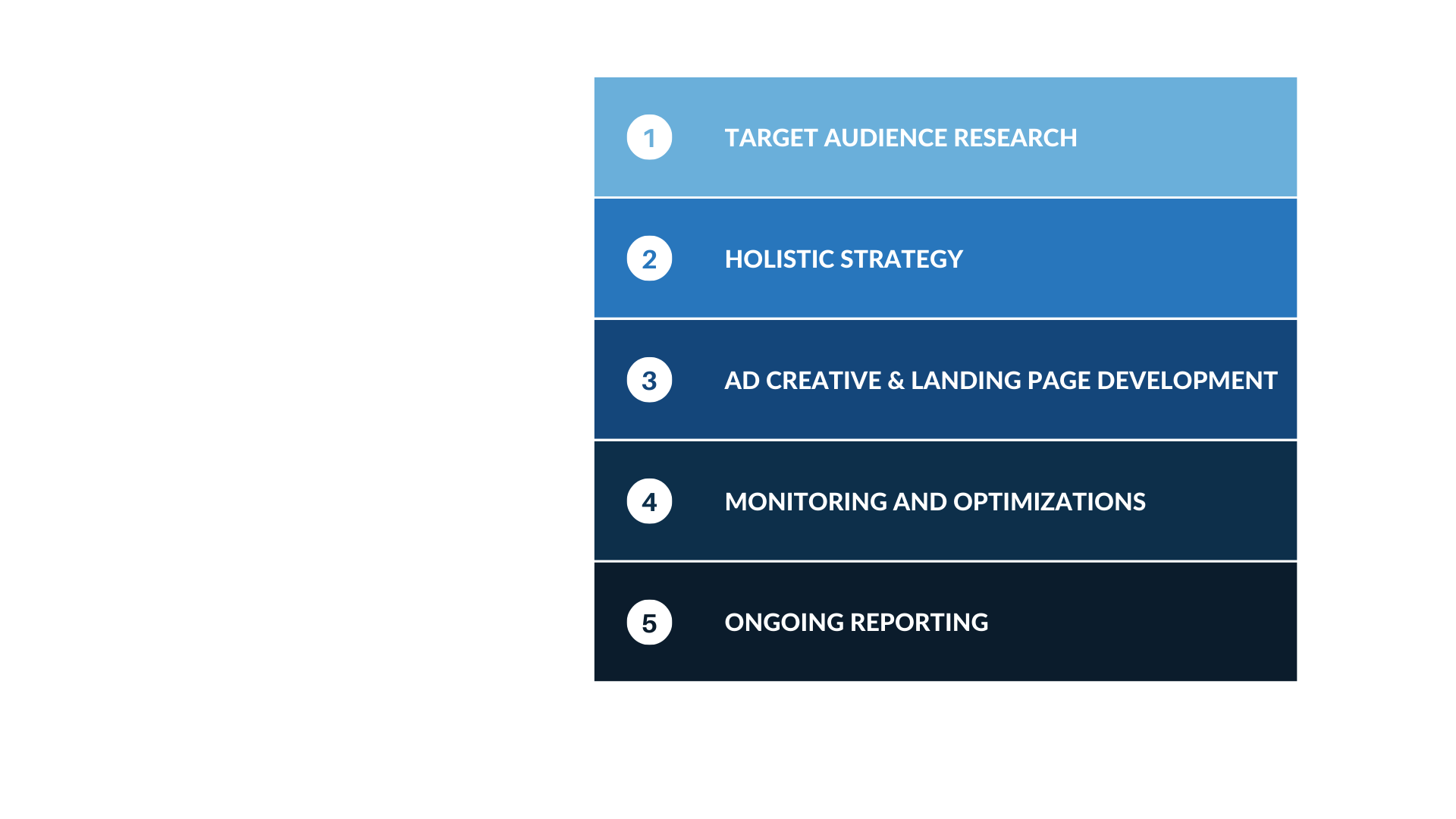 We utilize data from many different tools to ensure your budget is utilized efficiently, driving higher quality traffic and conversions to your website. We will also collaborate with our analytics, design, and UX teams to optimize the user's journey from ad to landing page to conversion, and improve the likelihood of engagement.